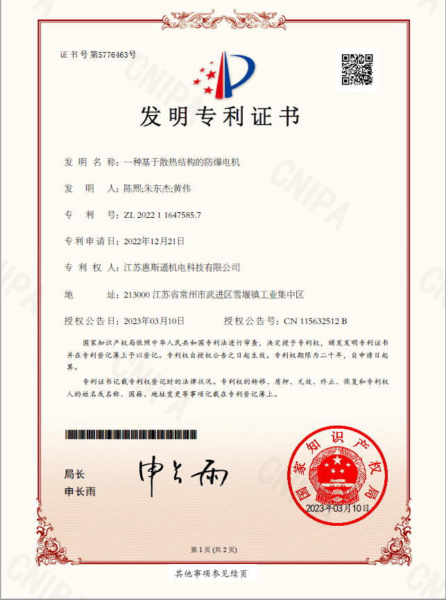 1種基于散熱結構的防爆電機發明專利證書